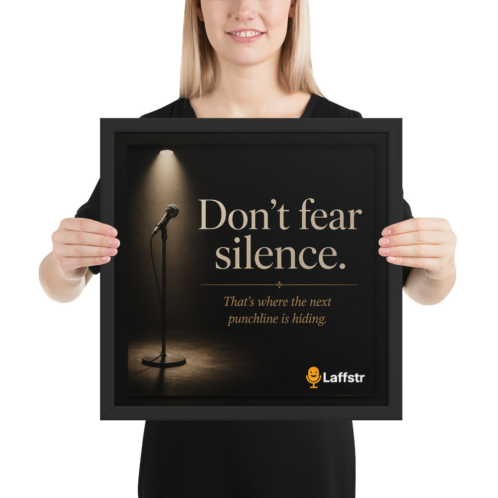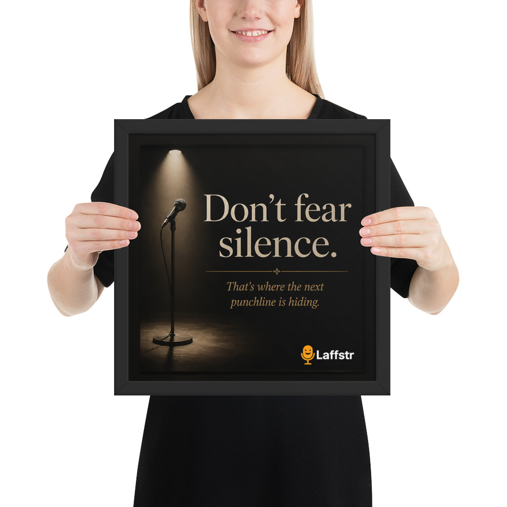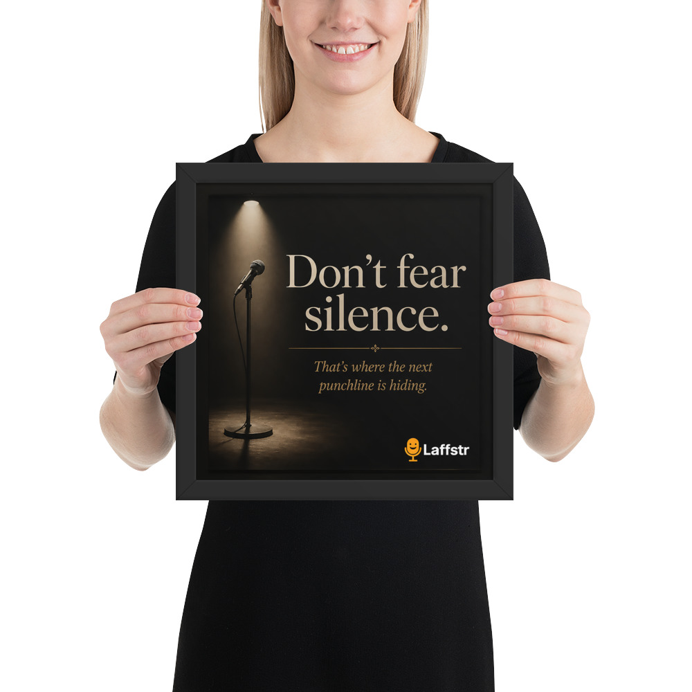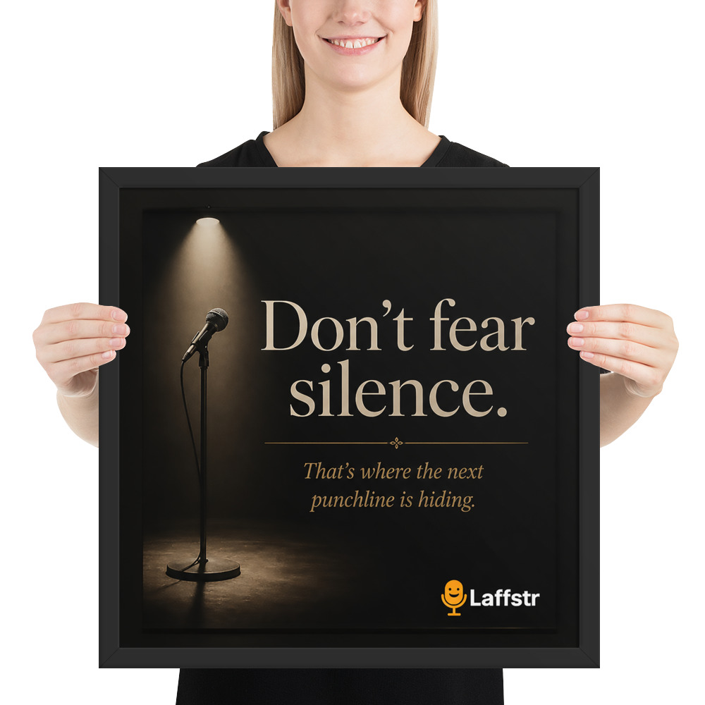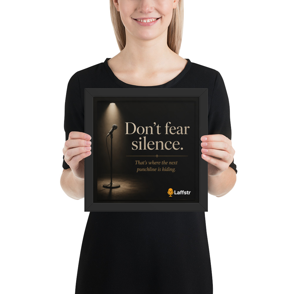 The “Don’t Fear Silence. That’s Where the Next Punchline Is Hiding” Framed Poster is inspirational wall art for comedians who are learning to trust the moment, sharpen their timing, and grow stronger every time they step on stage. Designed for beginning and intermediate stand-up comedians, this framed poster is a daily reminder that confidence, patience, and comic instinct are built one set at a time.