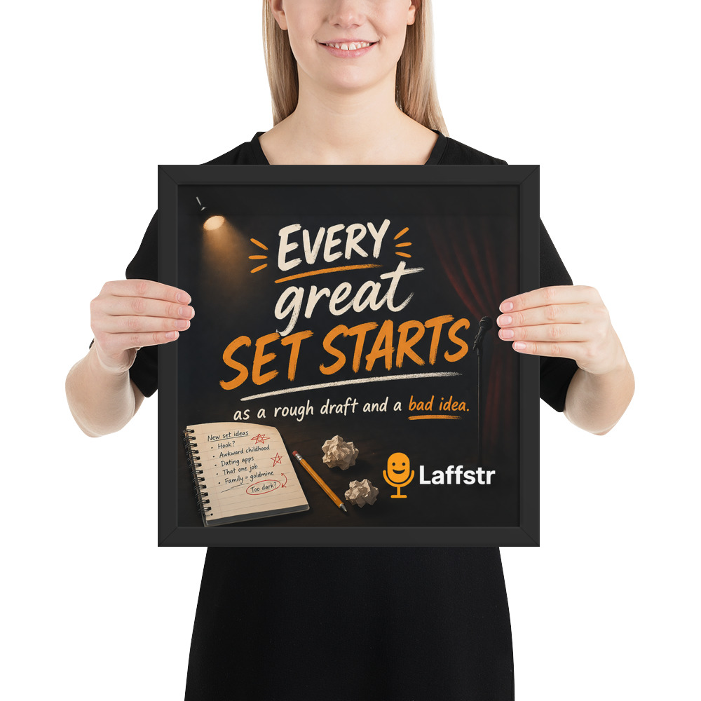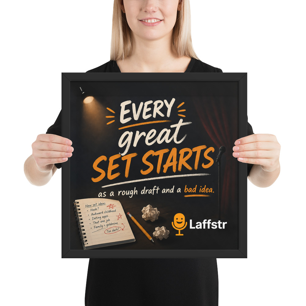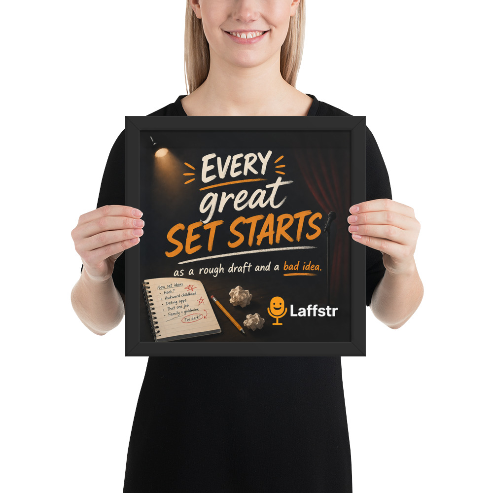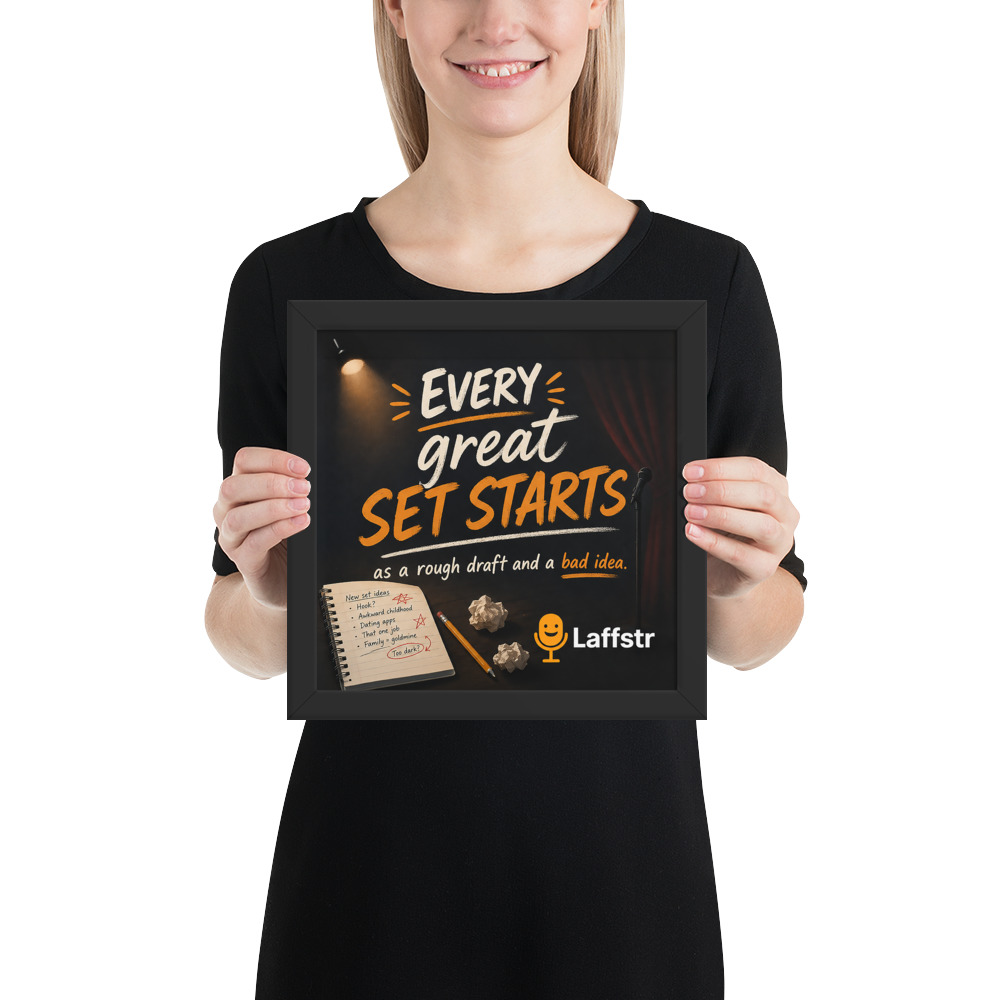 Behind every killer closer, every polished bit, and every unforgettable set is the same unglamorous beginning: a rough draft, a weird thought, a half-formed premise, or a joke that sounded better in your head. The “Every Great Set Starts as a Rough Draft and a Bad Idea” Framed Poster is a smart, funny, and motivating piece of wall art for comedians who need a daily reminder that great stand-up is built through messy first attempts, fearless experimentation, and relentless rewriting.