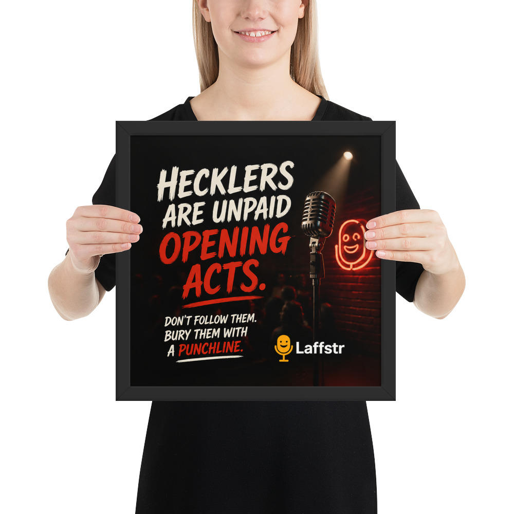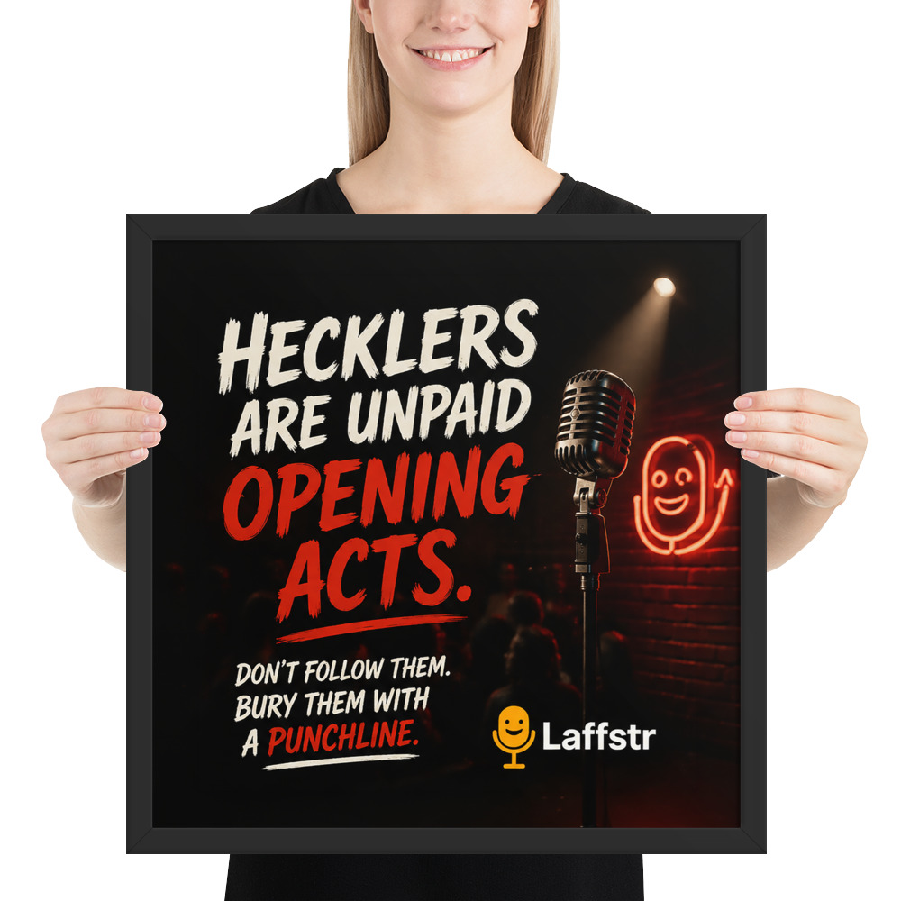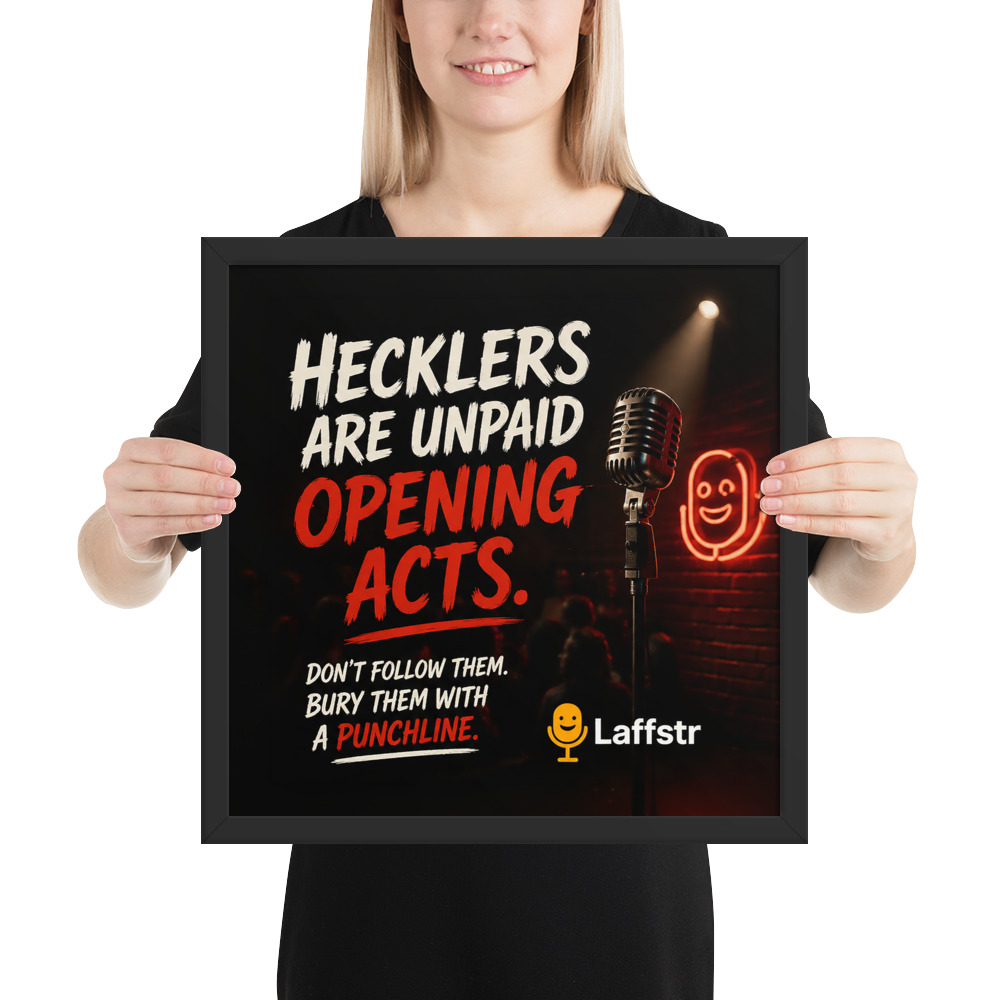 Every comic eventually faces the same test: how do you stay calm, stay funny, and stay in charge when somebody in the crowd thinks they are part of the show? This inspirational framed poster for comedians turns that hard truth into a battle cry.