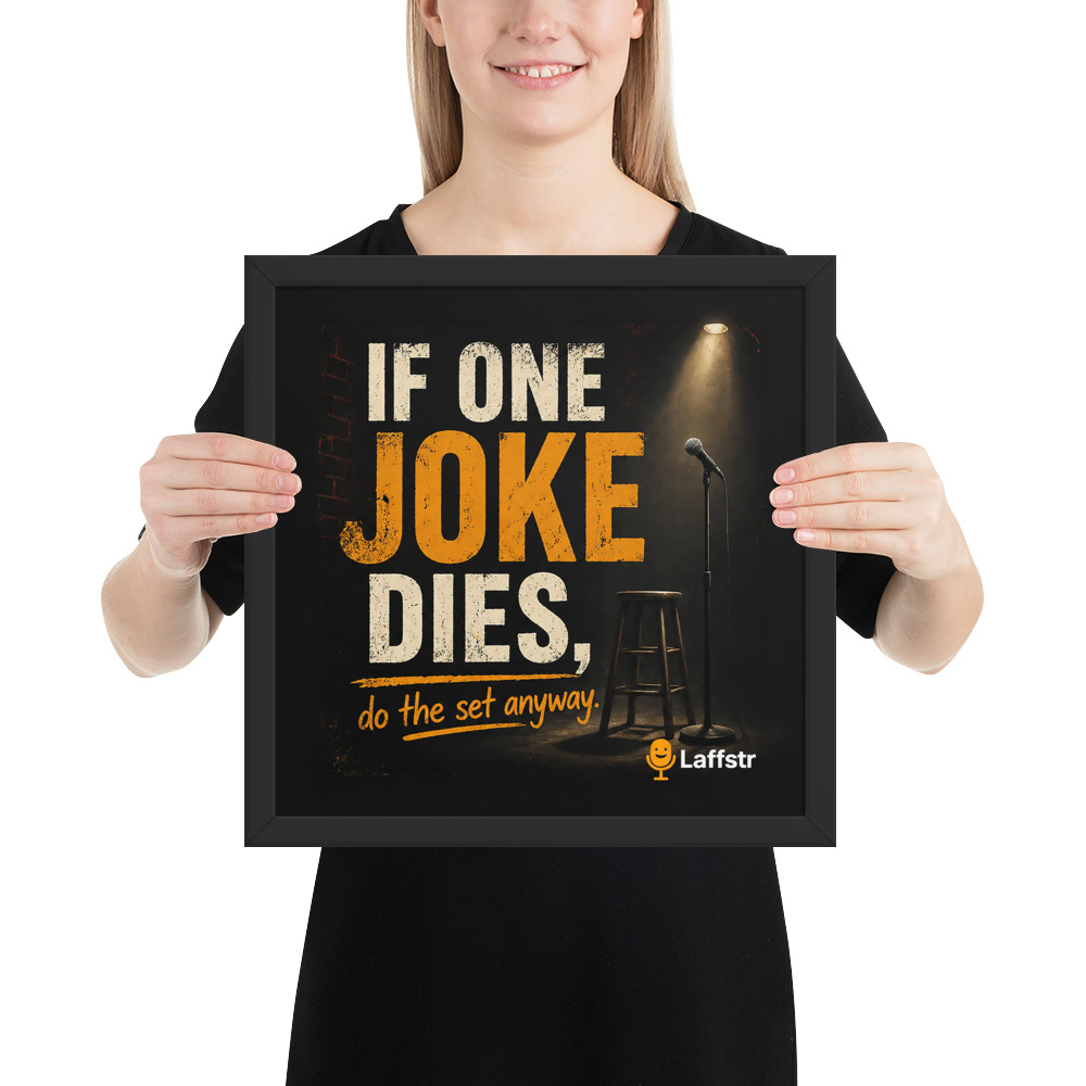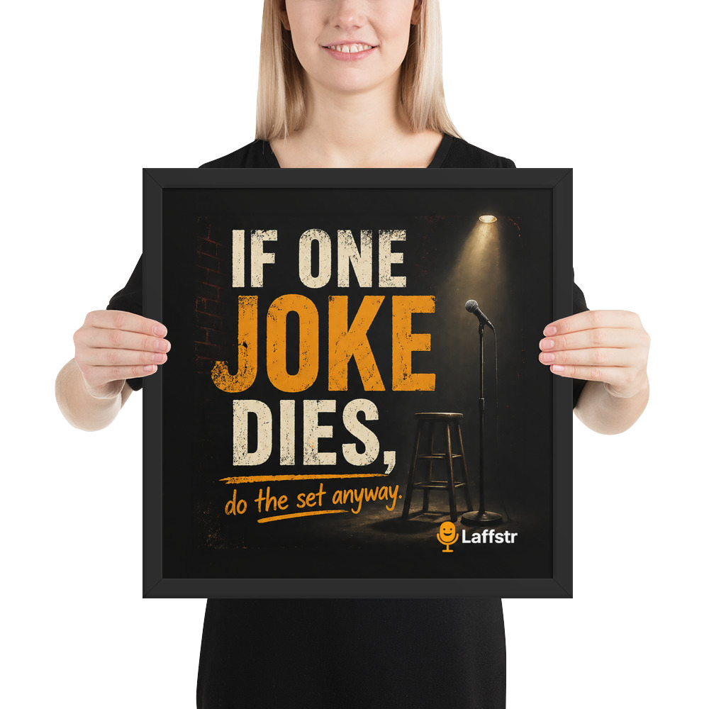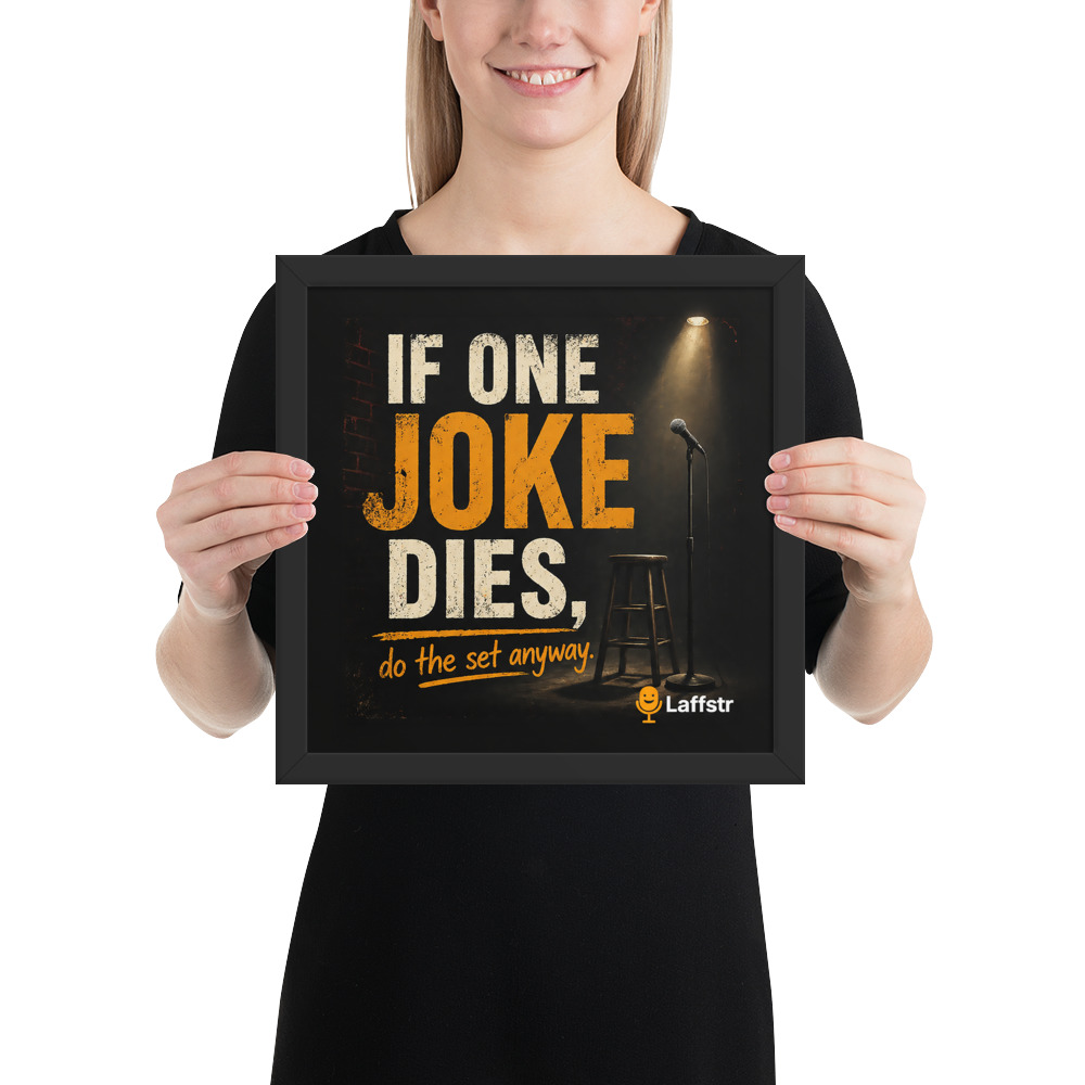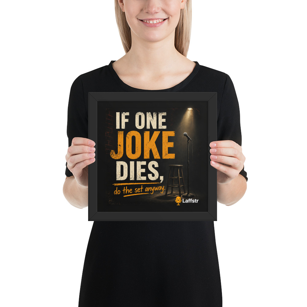 If you are searching for comedy wall art, motivational posters for comedians, framed comedy decor, stand-up comedy gifts, or an inspirational gift for a beginner comedian, the If One Joke Dies Do the Set Anyway Framed Poster is made for the comic who refuses to let one dead joke kill the whole night.