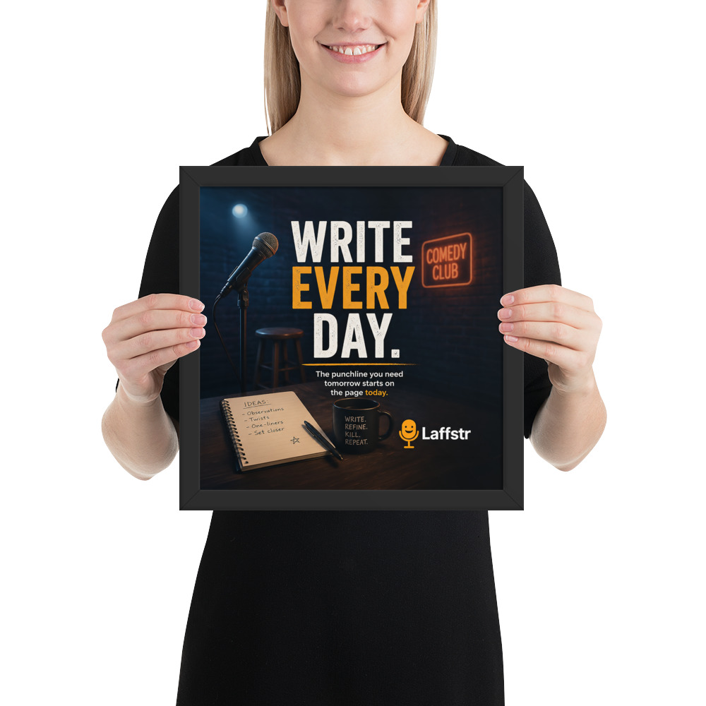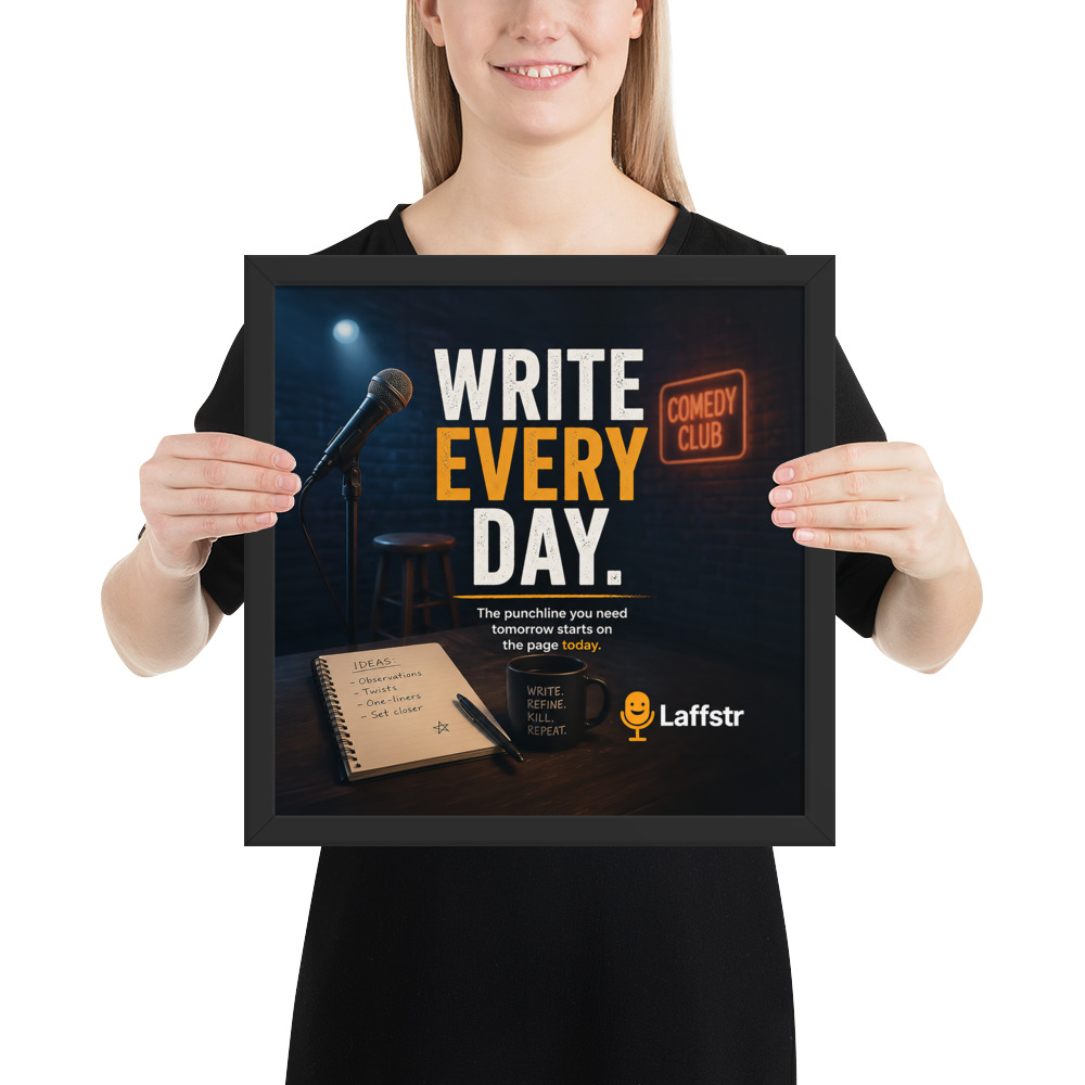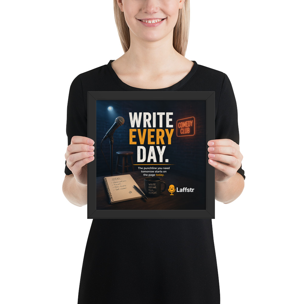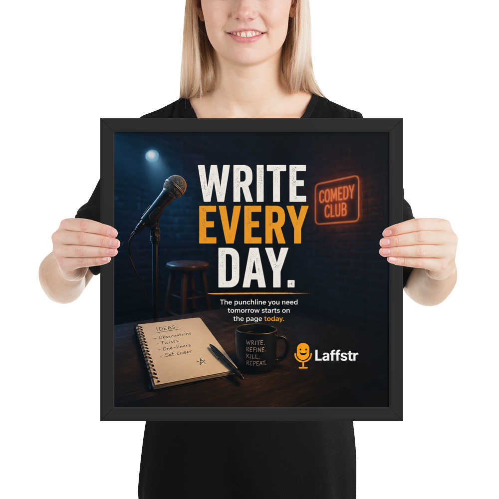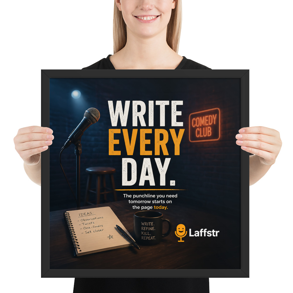 The “Write Every Day. The Punchline You Need Tomorrow Starts on the Page Today” Framed Poster is inspirational wall art for comedians who know that the real work of comedy begins long before the mic turns on. Designed for beginning comedians and intermediate stand-up comics, this framed poster is a daily reminder that stronger sets, sharper punchlines, and bigger laughs all begin with one simple habit: writing.
